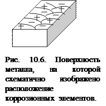 Обычно поверхность корродирующего металла представляет собой многоэлектродный коррозионный элемент (чередование катодных и анодных участков – рис. 10.6). В первом приближении эту поверхность можно считать как двухэлектродную систему, т.е. состоящую из участков двух видов: анодных и катодных. Коррозионный элемент (короткозамкнутый гальванический элемент) схематично можно изобразить: