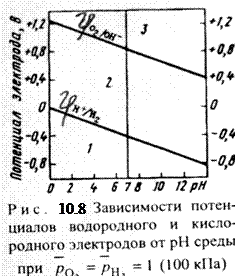 Потенциал восстановления ионов водорода (потенциал водородного электрода) зависит от парциального давления водорода и рН. При