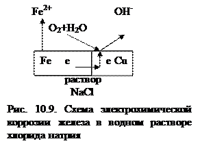 Какой именно процесс восстановления будет протекать на меди - зависит от состава электролита. В нейтральном водном растворе NaCl, контактирующем с воздухом, энергетически выгодным будет процесс восстановления кислорода, растворённого в воде. Рис. 10.8 подтверждает термодинамическую возможность коррозии железа с кислородной деполяризацией: