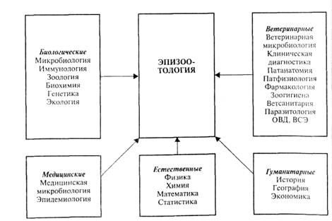 Эпизоотология тесно связана со многими науками, которые имеют как прямое (ветеринарные науки), так и косвенное отношение к проблеме инфекционных болезней (рис.).
