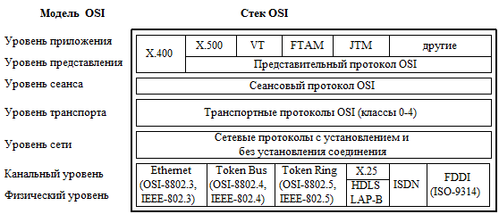 Следует различать стек протоколов OSI и модель OSI рис.3.1. Стек OSI – это набор вполне конкретных спецификаций протоколов, образующих согласованный стек протоколов. Этот стек протоколов поддерживает правительство США в своей программе GOSIP. Стек OSI в отличие от других стандартных стеков полностью соответствует модели взаимодействия OSI и включает спецификации для всех семи уровней модели взаимодействия открытых систем
