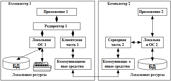 Если выдан запрос к ресурсу данного компьютера, то он переадресовывается локальной операционной системе. Если же это запрос к удаленному ресурсу, то он переправляется в клиентскую часть, где преобразуется из локальной формы в сетевой формат, и передается коммуникационным средствам. Серверная часть ОС компьютера 2 принимает запрос, преобразует его в локальную форму и передает для выполнения своей локальной ОС. После того, как результат получен, сервер обращается к транспортной подсистеме и направляет ответ клиенту, выдавшему запрос. Клиентская часть преобразует результат в соответствующий формат и адресует его тому приложению, которое выдало запрос.