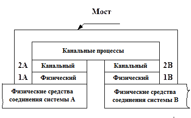 В соответствии с базовой эталонной моделью взаимодействия открытых систем мост описывается протоколами физического и канального уровней, над которыми располагаются канальные процессы. Мост опирается на пару связываемых им физических средств соединения, которые в этой модели представляют физические каналы. Мост преобразует физический (1A, 1B) и канальный (2A, 2B) уровни различных типов (рис. 9.4). Что касается канального процесса, то он объединяет разнотипные каналы передачи данных в один общий.