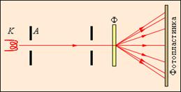 | Рисунок 3. Упрощенная схема опытов Дж. Томсона по дифракции электронов. K – накаливаемый катод, A – анод, Ф – фольга из золота. |