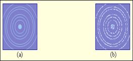 Рисунок 4. Картина дифракции электронов на поликристаллическом образце при длительной экспозиции (a) и при короткой экспозиции (b). В случае (b) видны точки попадания отдельных электронов на фотопластинку.