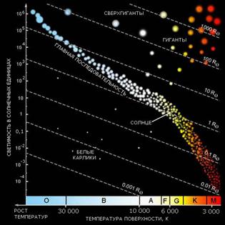 Звезды лежат на этой диаграмме не случайным образом, а образуют явно выраженные последовательности. Большинство звезд находится в пределах сравнительно узкой полосы, идущей от левого верхнего угла диаграммы к правому нижнему. Это так называемая «главная последовательность». В верхнем правом углу — довольно беспорядочная группировка звезд. Их спектральные классы — G, К, М. Это яркие звезды с абсолютными звездными величинами от +2 до -6 — «красные гиганты». В левой нижней части диаграммы — небольшое количество звезд. Их абсолютные величины +10 и больше, а спектральные классы от В до F. Т. е. это горячие звезды с низкой светимостью. Но низкая светимость при высокой поверхностной температуре может быть только тогда, когда радиус звезды мал. В этой части диаграммы находятся маленькие горячие звезды — «белые карлики».