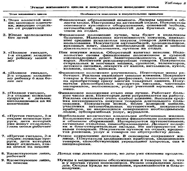 ВОЗРАСТ И ЭТАП ЖИЗНЕННОГО ЦИКЛА СЕМЬИ. С возрастом происходят изменения в ассортименте и номенклатуре приобретаемых людьми товаров и услуг. В первые годы человеку нужны продукты для детского питания. В годы взросления и зрелости он питается самыми разнообразными продуктами, в пожилом возрасте - специальными диетическими. С годами меняются и его вкусы в отношении одежды, мебели, отдыха и развлечений. Характер потребления зависит и от этапа жизненного цикла семьи. В табл. 8 перечислены девять этапов с указанием финансового положения и типичных товарных предпочтений семьи на каждом из них. Деятели рынка нередко определяют свои целевые рынки по этому признаку и разрабатывают соответствующие интересам конкретного этапа товары и целенаправленные маркетинговые планы. В некоторых работах последнего времени классификацию проводят по психологическим этапам жизненного цикла семьи. Взрослый человек переживает в своей жизни определенные переходные периоды, периоды трансформации.