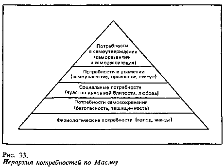 Теория мотивации Маслоу. Авраам Маслоу попытался объяснить, почему в разное время людьми движут разные потребности Почему один человек тратит массу времени и энергии на самосохранение, а другой -на завоевание уважения окружающих? Ученый считает, что человеческие потребности располагаются в порядке иерархической значимости от наиболее до наименее настоятельных. Разработанная Маслоу иерархия представлена на рис. 33. По степени значимости потребности располагаются в следующем порядке: физиологические потребности, потребности самосохранения, социальные потребности, потребности в уважении и потребности в самоутверждении. Человек будет стремиться удовлетворить в первую очередь самые важные потребности. Как только ему удается удовлетворить какую-то важную потребность, она на время перестает быть движущим мотивом. Одновременно появляется побуждение к удовлетворению следующей по важности потребности.