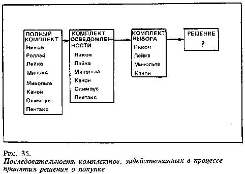 В результате сбора информации повышается осведомленность потребителей об имеющихся на рынке марках и их свойствах. До начала сбора информации Бетти знала только несколько марок фотокамер из полного комплекта доступных потребителю фотоаппаратов (см. крайний левый прямоугольник на рис. 35). Знакомые ей марки камер составляли ее комплект осведомленности. Вновь поступающая информация расширила рамки этого комплекта, а дополнительная информация помогла отсеять ряд марок из числа рассматриваемых. Оставшиеся марки, которые отвечали ее покупательским критериям, составили комплект выбора. Из этого комплекта Бетти и сделает свой окончательный выбор.