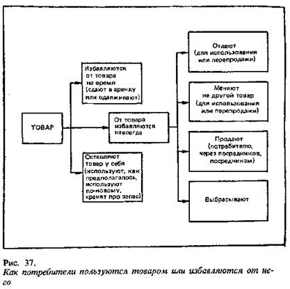 КОНЕЧНАЯ СУДЬБА КУПЛЕННОГО ТОВАРА. В поведении покупателя после покупки деятеля рынка должен интересовать еще один шаг, а именно: что потребитель в конце концов сделает с его товаром? Основные направления возможных действий представлены на рис. 37. Если потребитель приспособит товар для использования в каких-то новых целях, продавец, должен заинтересоваться, поскольку цели эти можно обыграть в рекламе. Если потребители откладывают товар про запас, почти не пользуются им или избавляются от него, это означает, что товар не очень удовлетворяет их и что благоприятная молва в его пользу будет не слишком активной. В равной мере интересно и то, как в конце концов потребитель избавится от товара. Если он продаст его или совершит с ним товарообменную сделку, это снизит объем продаж новых товаров. Учитывая все это, продавцу нужно изучать, как именно пользуются товаром и как избавляются от него, чтобы найти ответы на вероятные проблемы и возможности
