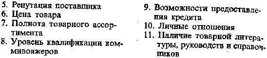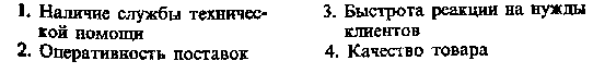 ВЫБОР ПОСТАВЩИКА. На этом этапе члены закупочного центра изучают предложения и переходят к выбору поставщика. Они оценивают не только техническую компетентность различных кандидатов, но и их способность обеспечить своевременную поставку товара и предоставление необходимых услуг. Нередко члены закупочного центра составляют перечень желательных характеристик поставщика с ранжированием их по степени относительной значимости. Так, например, при выборе поставщика химикатов один из закупочных центров составил следующую иерархию характеристик в порядке уменьшения их значимости.
