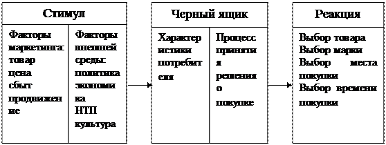 Базовая модель ПП в условиях рынка. Классик психологии Павлов разработал модель, получившую название «модель стимул-реакция». Иначе ее называют простой моделью поведения потребителей. (рис. 4.1). под стимулами понимаются побудительные факторы маркетинга и прочие раздражители. Они проникают в «черный ящик» сознания потребителей. Черный ящик – это человеческий мозг, который мы не можем понять. Дело в том, что каждый человек воспринимает все по своему. Реакция – это действия, которые потребительпредпринимает после того, как стимулы воспринимаются «черным ящиком».