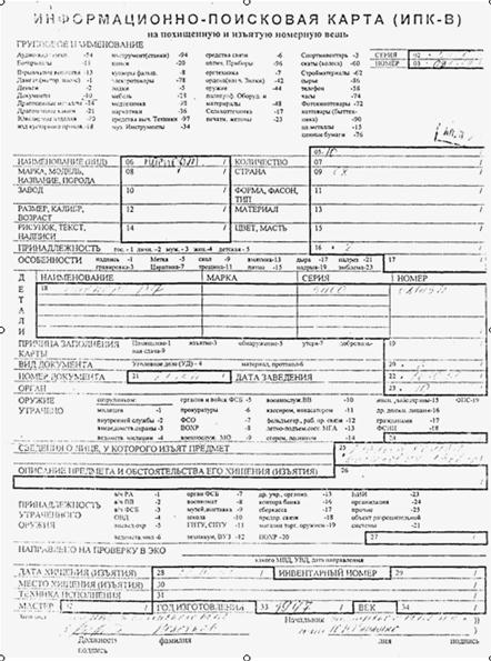 Для постановки на учет похищенных, изъятых номерных вещей и документов, коррекции данных, снятия их с учета используется информационно-поисковая карта на похищенную, изъятую номерную вещь - ИПК-В.