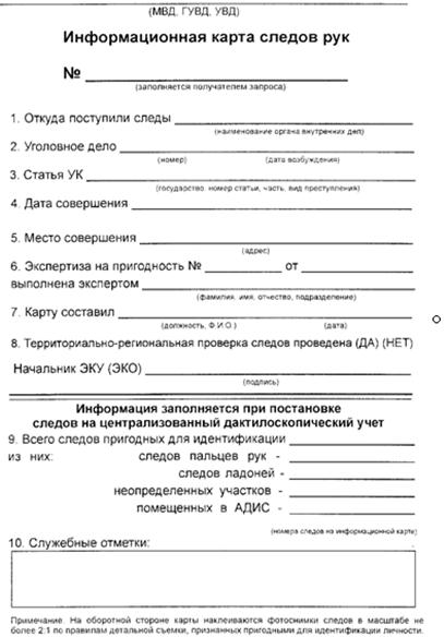 Учет формируется из информационных карт «Форма ИК-1», на оборотной стороне которых размещаются фотоснимки следов рук в масштабе 1:1, 2:1, 3:1, признанных пригодными для проверки по дактилоскопическим учётам и выполненным по правилам детальной съёмки (наличие масштабной линейки в основании следа).
