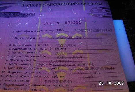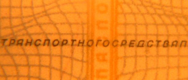Вид паспорта транспортного средства, сфотографированного при ультрафиолетовом свечении, на котором просматривается текст «Россия» (в зависимости от года выпуска ПТС текст может быть иным «ГИБДД и т.д.).