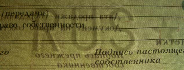 Вид паспорта транспортного средства, сфотографированного на просвет, на котором виден водяной знак в виде текста «RUS».