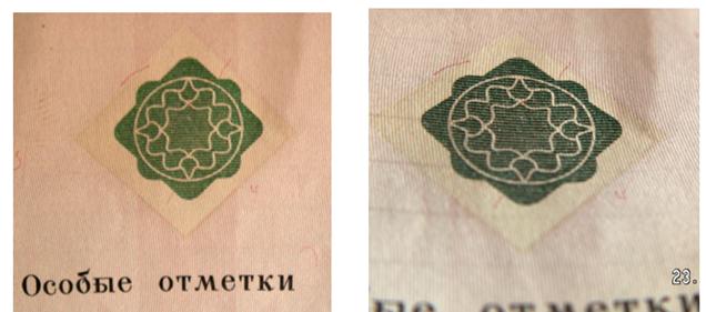 Вид особой отметки на паспорте транспортного средства, сфотографированной в двух разных положениях, в каждом из которых ее цветовое восприятие меняется.