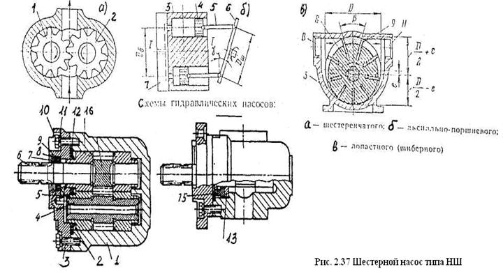 Шестеренный насос серии НШ состоит из корпуса 1, крышки 3 и качающего узла, в который входят вал 6 с ведущей 14 и ведомой 4 шестернями и четыре втулки 5. Крышка прикреплена к корпусу болтами 10, под головки которых подложены пружинные шайбы 11. Уплотнение вала состоит из манжеты 8, опорного кольца 7 и стопорного кольца 9; уплотнение крышки — из манжеты 12, двух колец 13, специального уплотнения 15 и вкладыша 16. Втулки 5 служат опорами для цапф и уплотнениями торцовых поверхностей шестерен, автоматически прижимая их при поступлении рабочей жидкости под давлением в камеру 2. Отжимающее усилие осуществляется давлением жидкости со стороны межзубных камер шестерен.