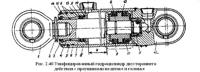 На рисунке показан унифицированный гидроцилиндр двухстороннего действия с проушинами 1 и 12 на штоке и на головке гидроцилиндра. Он имеет корпус 8, в котором перемещается поршень 10, закрепленный на штоке 7 гайкой 11 со стопорным кольцом. Для обеспечения герметичности на поршне и в передней направляющей втулке установлены манжеты 9. Для повышения долговечности уплотнительных манжет и колец перед ними в канавки помещены защитные кольца 13 из фторопласта или полиамида. С одной стороны к корпусу гидроцилиндра приварена проушина 12 головки, с другой — в нем закреплены букса 5 с втулкой 4 с помощью плоских стопорных колец 14 с шайбой 15. Шток перемещается во втулке и уплотнен в ней так же, как и поршень, манжетой 9 и защитным фторопластовым кольцом 13. Для повышения герметичности подвижного соединения во втулке и буксе установлены уплотнительные резиновые кольца 6. Выход штока уплотнен сальником 3, очищающим одновременно шток от пыли и грязи. Проушина 1 штока хвостовой частью ввернута в шток и закреплена штифтом 2.
