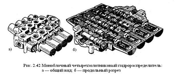 Моноблочные гидрораспределители бывают с ручным, механическим, гидравлическим и электрогидравлическим управлением. Они состоят из литого корпуса с двумя, тремя или четырьмя трех- и четырехпозици-онными золотниками, аналогичными по конструкции с секционными, и различаются условным проходом, числом золотников в одном блоке, схемной их соединения и способом управления. Различные компоновки секционных и моноблочных гидрораспределителей приведены в гидравлических схемах при описании строительных и дорожных машин.