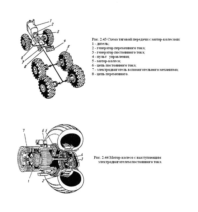 Подобная дизель-электрическая трансмиссия обеспечивает плавное, практически бесступенчатое, регулирование скорости машины в диапазоне 0—40 км/ч вперед и назад с одинаковой скоростью. Трансмиссия позволяет перераспределять мощность между мотор-колесами в зависимости от условий сцепления и их за-гружения. Из приведенного следует, что основными положительными свойствами рассматриваемых трансмиссий являются сочетание электрической тяги с индивидуальным приводом колес, обеспечивающим высокие регулировочные и тяговые свойства; независимость кинематической компоновки и конструктивной схемы машины от трансмиссии; высокая универсальность; использование ограниченного числа типоразмеров унифицированных мотор-колес на машинах различной мощности; простота и легкость управления. К недостаткам таких трансмиссий следует отнести значительную массу и размеры, высокую стоимость и большой расход меди для машин постоянного тока.