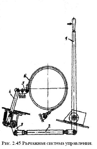 На рис.(2.45) показано управление ленточным тормозом от рукоятки. Движение от рычага 1 через регулировочную тягу 2 и рычаг 3 передается толкателю 4, который через рычаг 5 затягивает ленту б. Этот вид управления прост по устройству, удобен для обслуживания, но утомителен для машиниста из-за сравнительно больших усилий на перемещение рукояток и педалей.