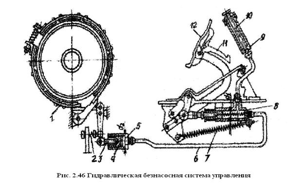 Гидравлические системы управления бывают двух видов: безнасосные и насосные. Во первых рабочее давление жидкости в гидросистеме создается мускульной силой оператора, воздействующего на педаль, рычаг или рулевое колесо, во вторых — насосом.