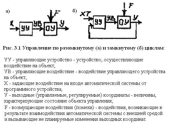 В разомкнутых системах (рис. 3.1, а)управляющее (регулирующее) воздействие задается без учета действительного выходного значения управляемой величины, а лишь на основании априори цели управления, характеристик объекта и известных внешних воздействий. Такое управление называют жестким, без обратной связи. Разомкнутые системы используют для дистанционного управления (управление на расстоянии), но без применения корректирующих воздействий на данном цикле управления.