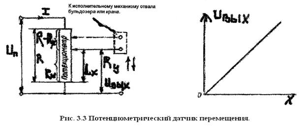 Характеристика потенциометрический датчика (рис. 3.3, б) представляет собой зависимость изменения сопротивления (и соответственно выходного напряжения) от непрерывного изменения регулируемого параметра (перемещения). Выходное напряжение потенциометрического датчика в режиме холостого хода, когда нагрузка не подключена, Uвых=IRх=UпRx/R, где I — ток, протекающий по датчику, A; /Rx — сопротивление активной (рабочей) части датчика, Ом; Un — напряжение питания датчика, В; R — полное сопротивление датчика, Ом.
