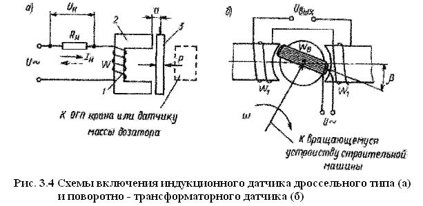 Принцип действия поворотно-трансформаторного датчика (рис 3.4, б) основан на изменении взаимной индукции потокосцепления и значения ЭДС в обмотках датчика при перемещении ферромагнитного сердечника с обмоткой Wb. На обмотку возбуждения Wb, расположенную на среднем стержне, подается напряжение питания Ubx, а с обмоток Wi которые расположены на крайних стержнях, снимается выходное напряжение Uвых