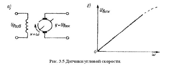 К генераторным датчикам относятся тахогенераторы, которые представляют собой маломощные электрические машины, преобразующие механическое вращение в электрический сигнал. Тахогенераторы на выходе дают напряжение Uвых пропорциональное частоте вращения, и применяются в качестве электрических датчиков угловой со и линейной V скоростей. В зависимости от вида выходного напряжения и конструкции они делятся на тахогенераторы постоянного и переменного тока.