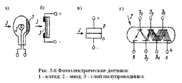 Электровакуумные фотоэлементы в последнее время заменяют более эффективными полупроводниковыми фотоэлементами и электровакуумными фотоэлектронными умножителями (рис. 3.6, г). В последних за счет использования явлений вторичной эмиссии промежуточных эмиттеров (Эl—Эб), расположенных между катодом (К) и анодом (А), поток электронов, испускаемый катодом, может быть усилен в Ю5...10б раз. Это позволяет применять фотоумножители без последующего усиления сигнала.