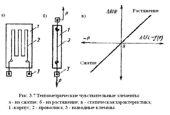 то при растяжении оно стало R + ∆R. Относительное изменение сопротивления тензодатчика пропорционально усилию, приложенному к нему (рис. 3.7, в).