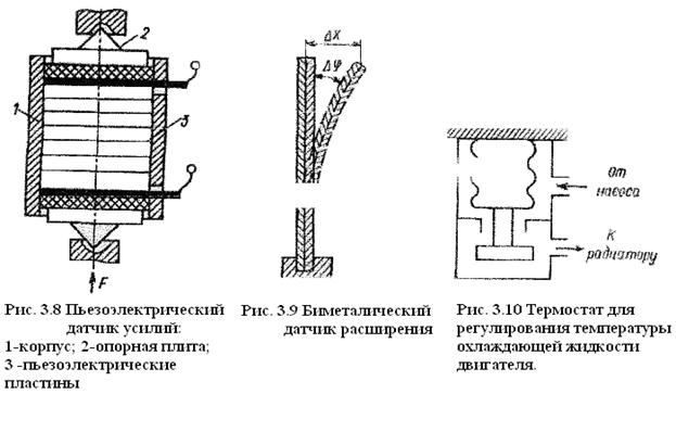 Во всех машинах строительного и коммунального назначения с двигателями внутреннего сгорания датчиком температуры в системе охлаждения двигателя служит термостат (рис. 3. 10). Он представляет собой гофрированный баллон (сильфон), внутри которого находится легко испаряющаяся жидкость или твердый наполнитель с большим коэффициентом линейного расширения (например, церезин). При повышении температуры баллон удлиняется, а при понижении — сокращается. При этом закрепленный на баллоне клапан включает и отключает радиатор, поддерживая таким образом необходимую температуру.