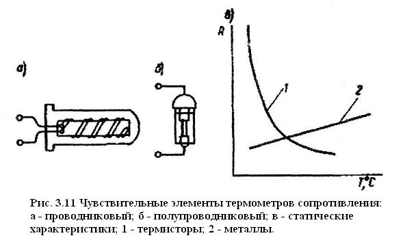 Для проводниковых терморезисторов используют чистые металлы (медь, никель, платину). Их статическая характеристика в диапазоне О...1ОО°С практически линейна (рис.3.11 в):