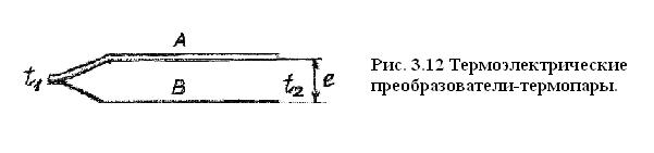 термопара — относятся к устройствам генераторного типа. Они работают на принципе возникновения термоэлектродвижущей силы (термо-ЭДС) в двух сваренных друг с другом разнородных металлах А и Б при нагреве места спая (рис. 3.12). Значение термо-ЭДС пропорционально разности температур ∆tмежду спаем и свободными концами: е = k∆t (к — термоэлектрический коэффициент, зависящий от свойств материалов термопары). Значение термо-ЭДС не зависит от формы и геометрических размеров электродов. ЭДС на свободных концах термопары объясняется тем, что энергия свободных электронов в разных материалах неодинакова и по-разному зависит от температуры. Однако с ее увеличением энергия свободных электронов возрастает. Это вызывает их поток к холодному концу термопары, где накапливается отрицательный заряд. Разное число свободных электронов вызывает разность потенциалов на их свободных концах. При замыкании свободных концов потечет электрический ток, значение которого пропорционально разности t1 — t2