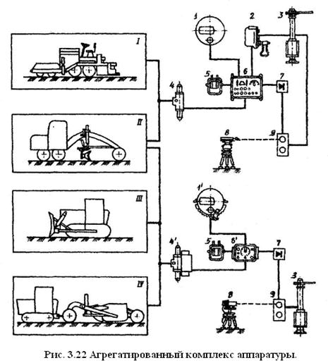 Агрегатированные комплекты позволяют развивать аппаратуру и системы автоматики с максимальной унификацией их элементов. Системы автоматического управления положением рабочего органа дорожностроительных, аэродромных и мелиоративных машин разделяют на одно-, двух- и трехканальные. Одноканальные системы управления удерживают рабочий орган машины в заданном положении в одной плоскости: поперечной у автофейдеров, продольной у скреперов и бульдозеров. Такими системами являются «Профиль-1» и «Профиль-10» для легких и средних автогрейдеров, «Стабилоплан-1», «Стабилоплан-10», «Копир-Стабилоплан» для скреперов, «Автоплан-1» и «Копир-Автоплан-10» для бульдозеров. Двухканальные системы управления обеспечивают обычно стабилизацию положения рабочего органа одновременно в продольной и поперечной плоскостях. К числу таких систем относятся «Профиль-2» и «Профиль-20» для тяжелых и средних автогрейдеров, «Стабилослой-1» и «Стабилослой-10» для укладчиков покрытий, «Ком-биплан» для бульдозеров. Трехканальные системы содержат обычно помимо каналов управления положением рабочего органа в двух ортогональных вертикальных плоскостях канал управления движением машины в плане — «по курсу». Такие системы управления «Профиломат-1» и «Профиломат-2» > используют на профилировщиках основания и укладчиках покрытий, входящих в комплект машин типа ДС-110 для скоростного строительства магистральных дорог и взлетно-посадочных полос.