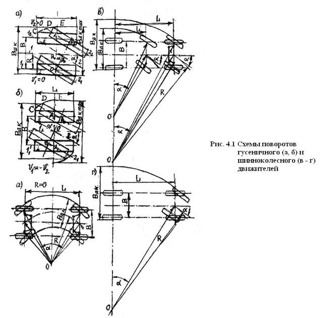 Для шинноколесных машин радиус поворота R определяется как радиус дуги окружности средней точки оси управляемых колес (рис. 4.1, в, д) или колес с управляемой осью (рис. 4.1, г). I Он зависит от угла поворота а: чем больше этот угол, тем меньше радиус R. С уменьшением базы машины L1 (расстояния между осями задних и передних колес), уменьшается также радиус | поворота. Поэтому для работы в стесненных условиях обычно применяют короткобазовые пневмоколесные движители. Меньшие радиусы поворота имеют также двухосные колесные движители со всеми управляемыми колесами (рис. 4.1,д). Гусеничные машины более маневренны по сравнению с шинноколесны-ми, выполненными по описанным выше схемам, в связи с тем, что они имеют меньшие радиусы поворота.