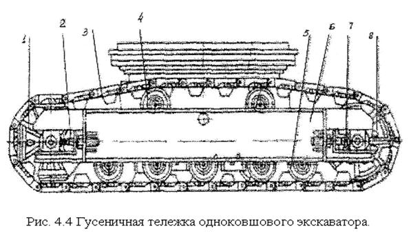 В строительных машинах массой до 1000 т применяют, в основном, двухгусеничные движители, каждая гусеница которых состоит из ходовой рамы 6 (рис. 4.4) замкнутой гусеничной ленты 3, огибающей ведущее 1 и направляющее 8 колеса, опорных 5 и поддерживающих 4 катков.