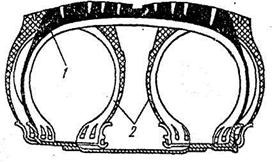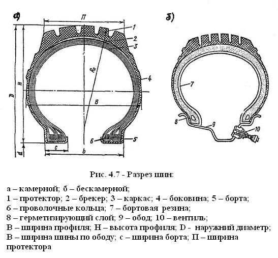 Пневматические шины могут быть камерными (рис. 4.6, 5) и бескамерными (рис. 4.6, в). Камерная шина состоит из покрышки, камеры, ободной ленты и вентиля для накачивания воздуха в камеру. Бескамерные шины представляют собой покрышки, герметически прилегающие к ободьям. Покрышки изготовляют из резины, армированной тканевым и металлическим кордом. Утолщенная периферийная часть покрышки (протектор) имеет рифления определенной формы, называемые рисунком протектора. Различают шины обычного профиля для землеройных машин (рис. 4.6, а) для работы в каменных карьерах 3); противобуксующие 4; 8;) и универсальные 5; 6) Для повышения проходимости при работе на слабых и рыхлых грунтах, а также по снегу используют широкопрофильные и арочные (рис. 4.6, 7) шины с повышенной опорной поверхностью и развитыми грунтозацепами. При работе арочных шин на твердых грунтах и дорогах с твердым покрытием сопротивление передвижению машины увеличивается, а срок службы