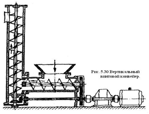 Реже применяют вертикальные винтовые конвейеры (рис. 5.30), в которые материал поступает от горизонтального конвейера, создающего подпор.