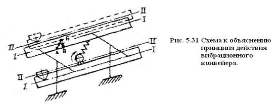 Ввибрационном конвейере (рис. 5.31; 5.32) загруженному транспортируемым материалом желобу сообщаются несимметричные колебания так, что средняя скорость его перемещения р одном направлении значительно превышает среднюю скорость в противоположном направлении. При движении с меньшей скоростью желоб перемещается из положения в положение вместе с находящимся на нем материалом (точки соответственно А и Б).