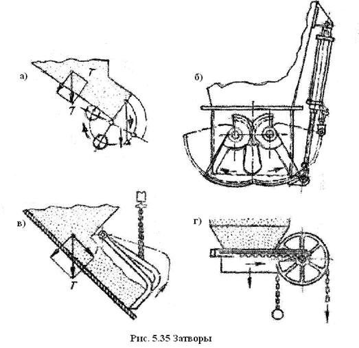 Питатели предназначены для непрерывной выдачи материалов из бункеров. Ленточные и пластинчатые питатели (рис.5.36, а иб)обычно имеют кривсшишю-храповой привод, обеспечивающий небольшую скорость перемещения (0,05 - 0,5 м/с.) Ленточные питатели пригодны для выдачи материалов как пылевидных, так и средне-кусковых; их производительность достигает 300 м3/ч. Производительность пластинчатых питателей 1000 м3/ч. Применяют их для подачи средне- и крупнокусковых материалов.
