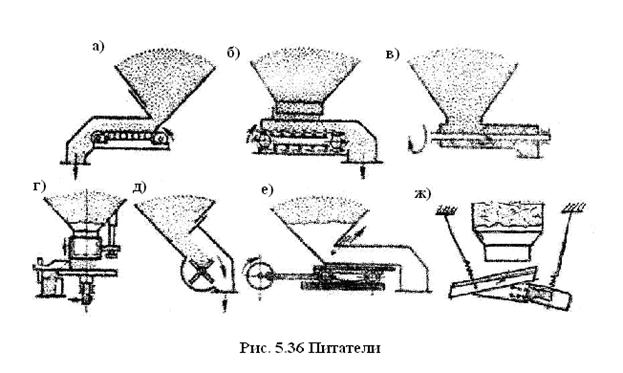 Винтовые питатели (рис. 5.36, б) используют при работе с сыпучими материалами. Производительность их до 30 м3/ч. Тарельчатые питатели (рис. 5.36, г) применяют для материалов различной крупности при производительности до 25 м3/ч. Барабанные лопастные питатели (рис.5.36, д) могут выдавать материал порциями, для чего они поворачиваются на определенный угол. Кареточные и вибрационные питатели (рис.5.36, е и ж) тоже выдают материал порциями. Последние три питателя служат не только для выдачи материалов, но и для их дозирования.