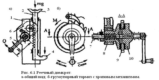 Усилие Q (Н) на рукоятке при подъеме груза массой т (кг) определяют из уравнения моментов относительно оси зубчатого колеса, связанного с рейкой: