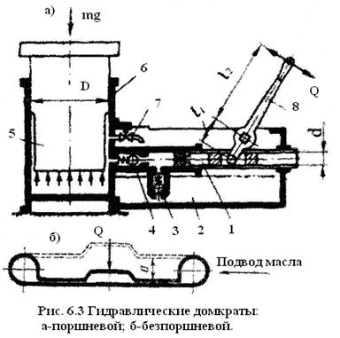 Гидравлический домкрат (рис. 6.3) состоит из цилиндра б с поршнем 5, насоса У, всасывающего 3, нагнетательного 4 и спускного 7 клапанов, а также масляного бака 2. В качестве рабочей жидкости используется минеральное масло или незамерзающая смесь из воды со спиртом или глицерином. При возвратно-поступательном движении поршня насоса, приводимого рукояткой 8, рабочая жидкость засасывается из бака через клапан 3 и нагнетается под поршень 5 через клапан 4, выталкивая его из цилиндра и поднимая груз на торцовой поверхности поршня. Опускают груз гравитационно после открытия спускного клапана.