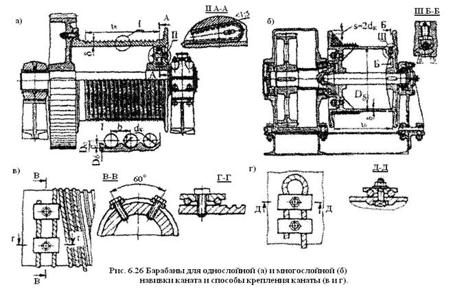 Барабаны (рис.6.26) цилиндрической формы с бортами (ребордами) для предотвращения соскальзывания каната изготовляют из чугунного или стального литья или сварными из листовой стали. Канат укладывается на барабане в один слой (однослойная навивка) или в несколько слоев (многослойная навивка). В первом случае рабочая поверхность барабана имеет канавки (рис.6.26,а), а во втором случае ее выполняют гладкой (рис.6.26, б). При однослойной навивке двух ветвей каната канавки нарезают зеркально от середины барабана: одна половина с правой нарезкой, другая - с левой. Конец каната закрепляют на барабане клином (рис.6.26, а, узел //), винтом (рис. 6.26, узел ///) или прижимными планками с болтами на рабочей поверхности барабана (рис.6.26 в, г) или на его реборде.