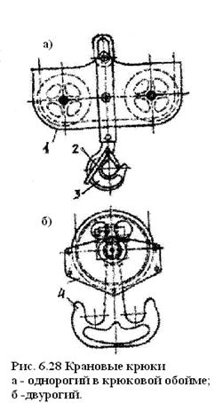 Простейшими грузозахватными устройствами являются однорогие 3 (рис. 6.28,а) или двурогие 4 (рис.6.28 б) крюки. Они предназначены для подвешивания к ним грузов непосредственно или с помощью чалочных устройств или захватов. Однорогие крюки применяют для работы с грузами до 75 т, а двурогие для грузов от 5 т и выше. Крюки изготовляют из стали ковкой или штамповкой, а также (при массе груза 50 т и более) пластинчатыми из листового металла. Для предотвращения самопроизвольного выпадания съемного грузозахватного приспособления грузовые крюки кранов и электрических талей снабжают предохранительным замком 2 (рис. 6.28a).
