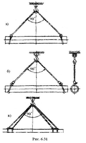Требуемой грузоподъёмности Q - 6 т соответствует строп 4 - СК 1-6,3 При предельном разводе диагонально расположенных ветвей с углом между ними 90° угол отклонения каждой ветви от вертикали составит 45°. Расстояние между диагонально расположенными чалочными петлями: Рис.6.32. Схемы строповки грузов.
