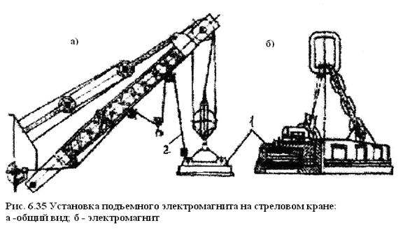 Для перемещения стальных листов и проката в целях строительных металлических конструкций применяют подъёмные к крюку крана и не требующие строповки грузов. Длинномерные грузы поднимают двумя электромагнитами, размещенными на траверсе. Электромагниты питаются постоянным током, подаваемым к ним по кабелю 2 от генератора, установленного на кране. Грузоподъемность электромагнита зависит от зазора между грузом и магнитными полюсами. Большая грузоподъемность обеспечивается при подъеме грузов с ровной плоской прилегающей к магниту поверхностью. Для подъема немагнитных листовых грузов (перегородочных плит, фанеры, листового стекла, бетонных изделий) применяют вакуумные грузозахватные устройства (рис. 6,36), в виде вакуумных присосов диаметром до 400мм с резиновым ободом, из полости которых вакуумными насосами удаляется воздух.